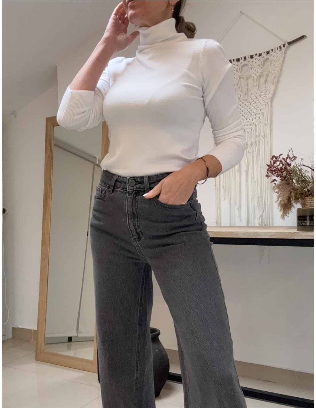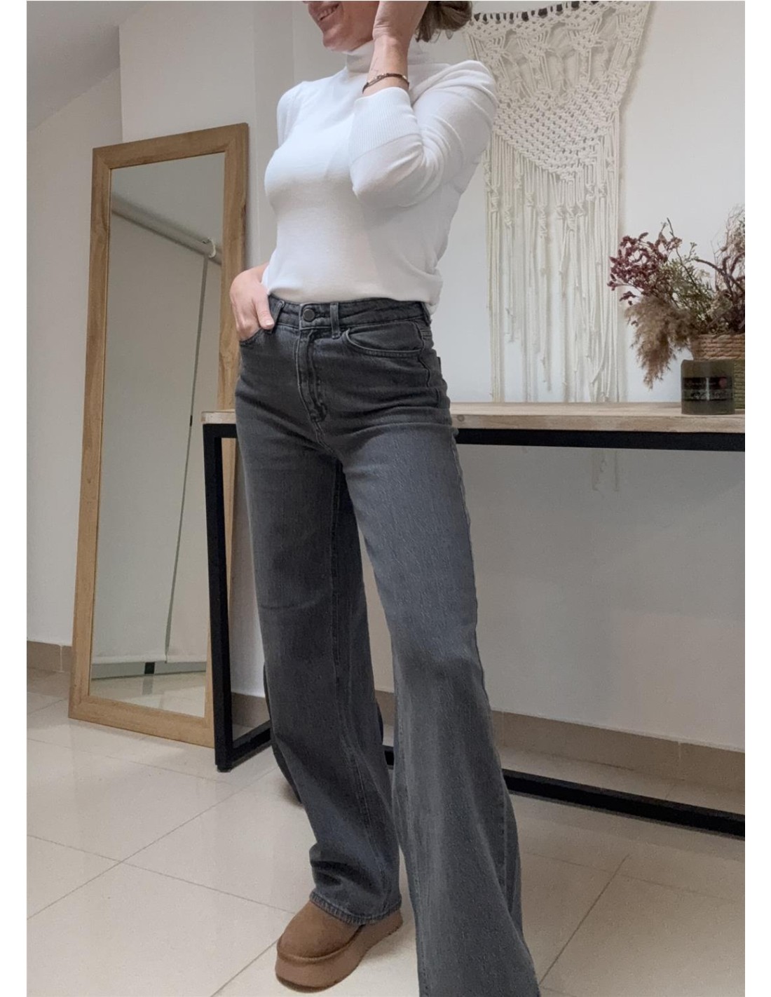 Denim de pernera amplia en color gris.