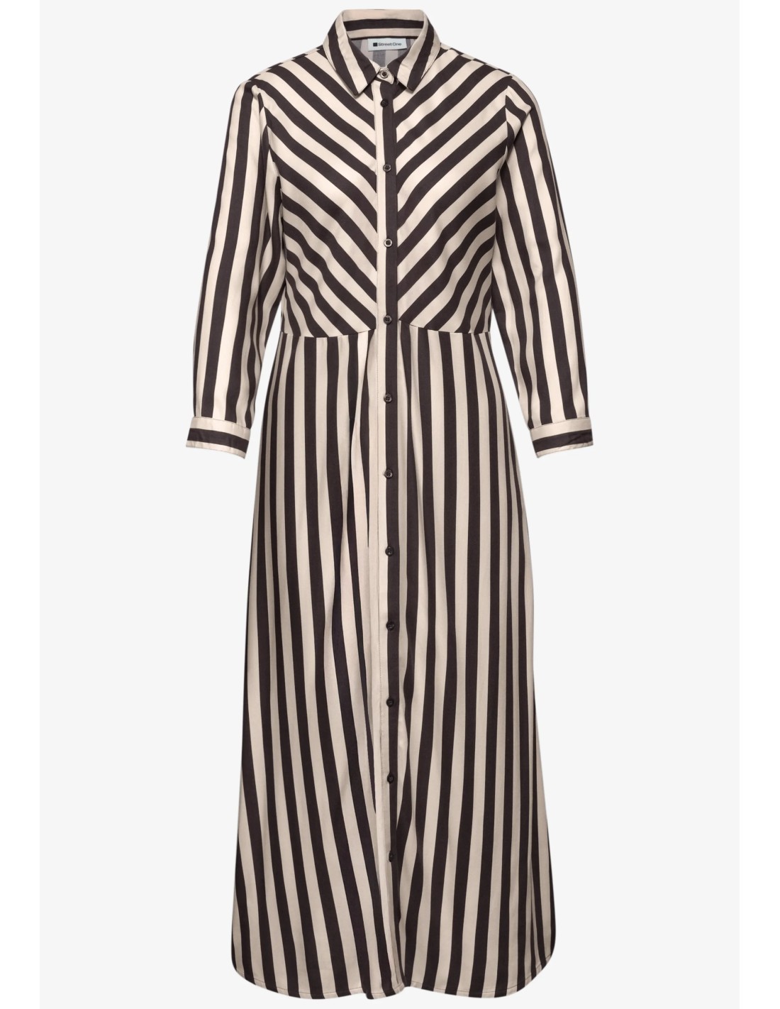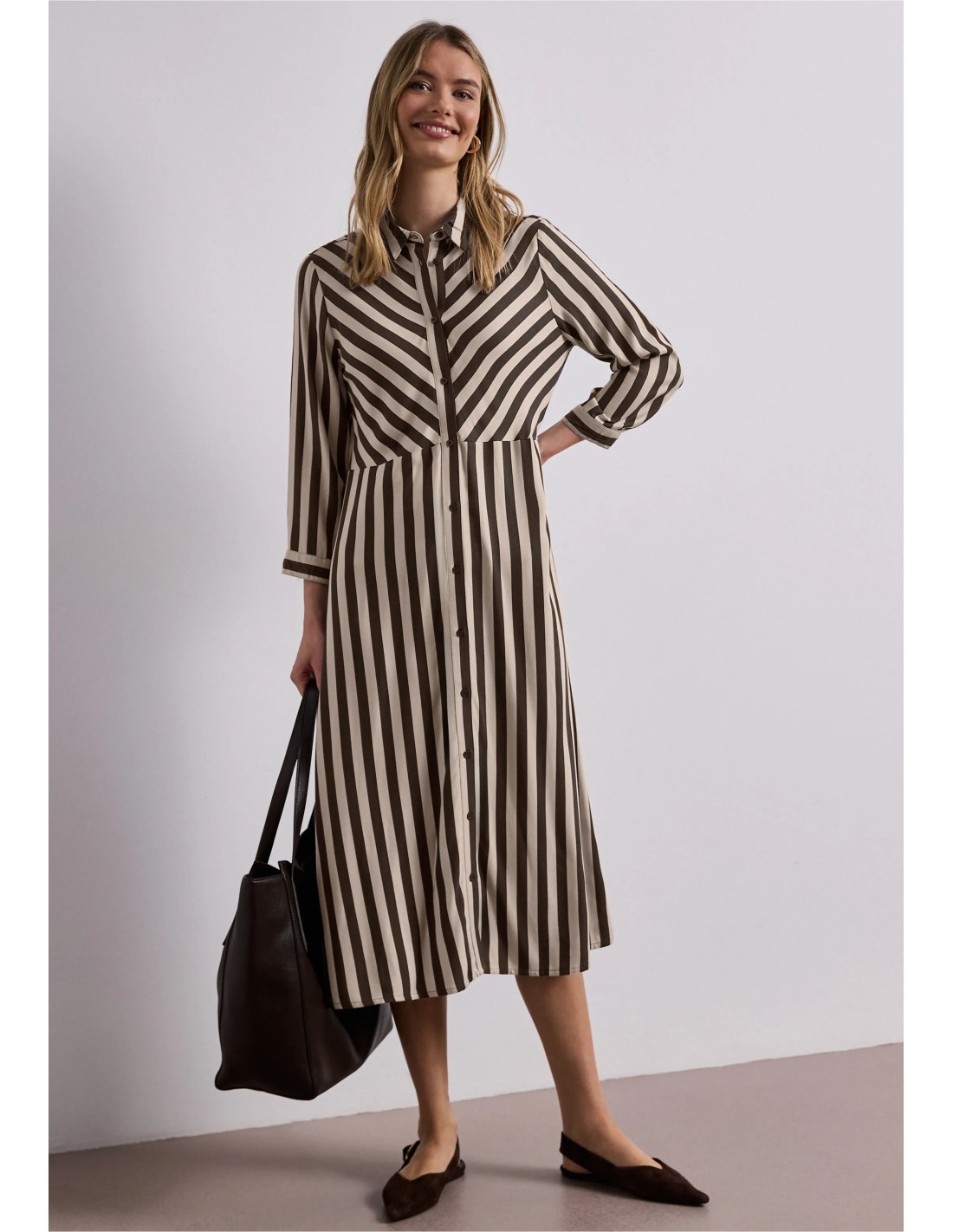 Vestido camisero con manga francesa y solapa, te verás muy estilizada con este estampado vertical de rayas marrones y beige.